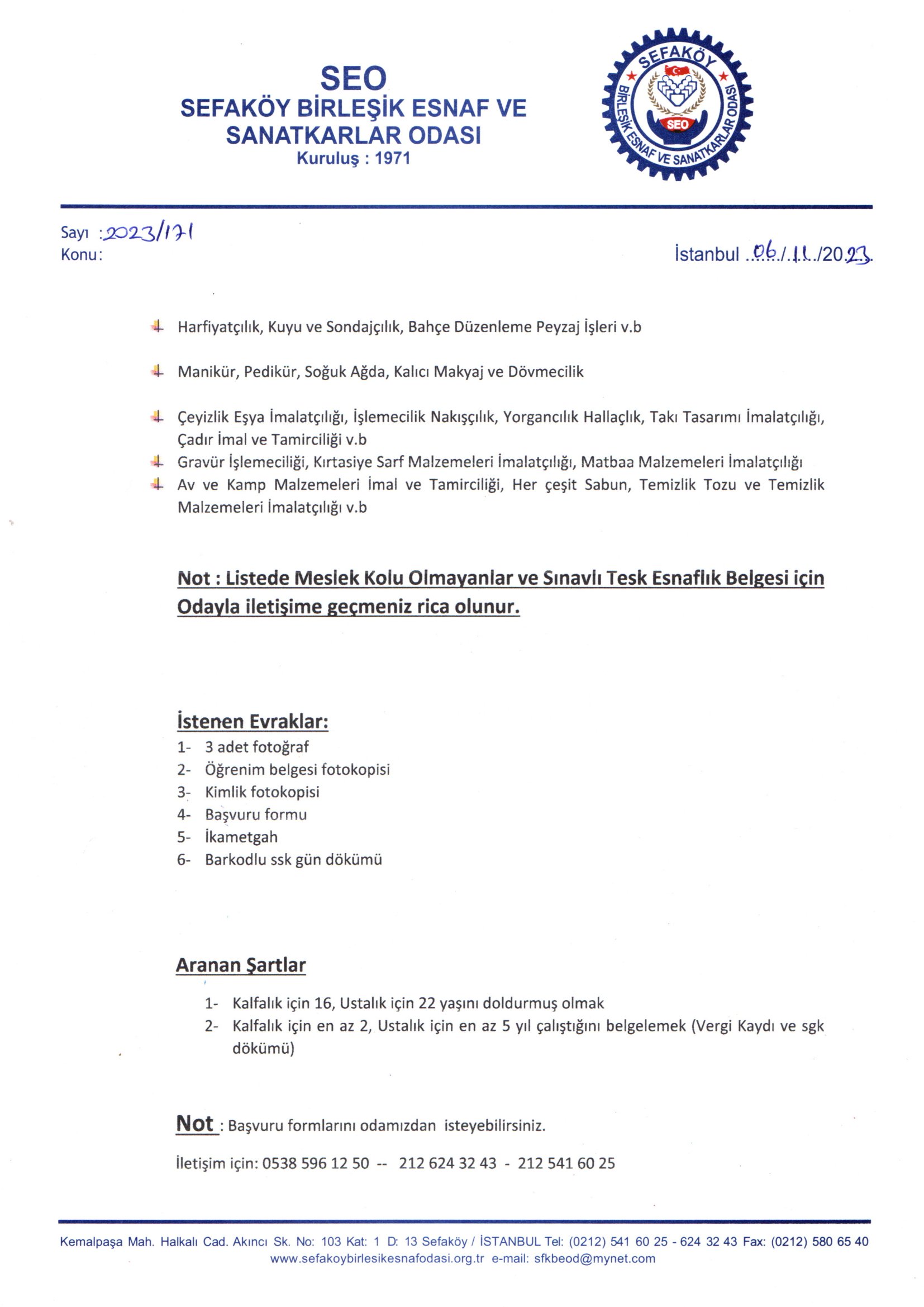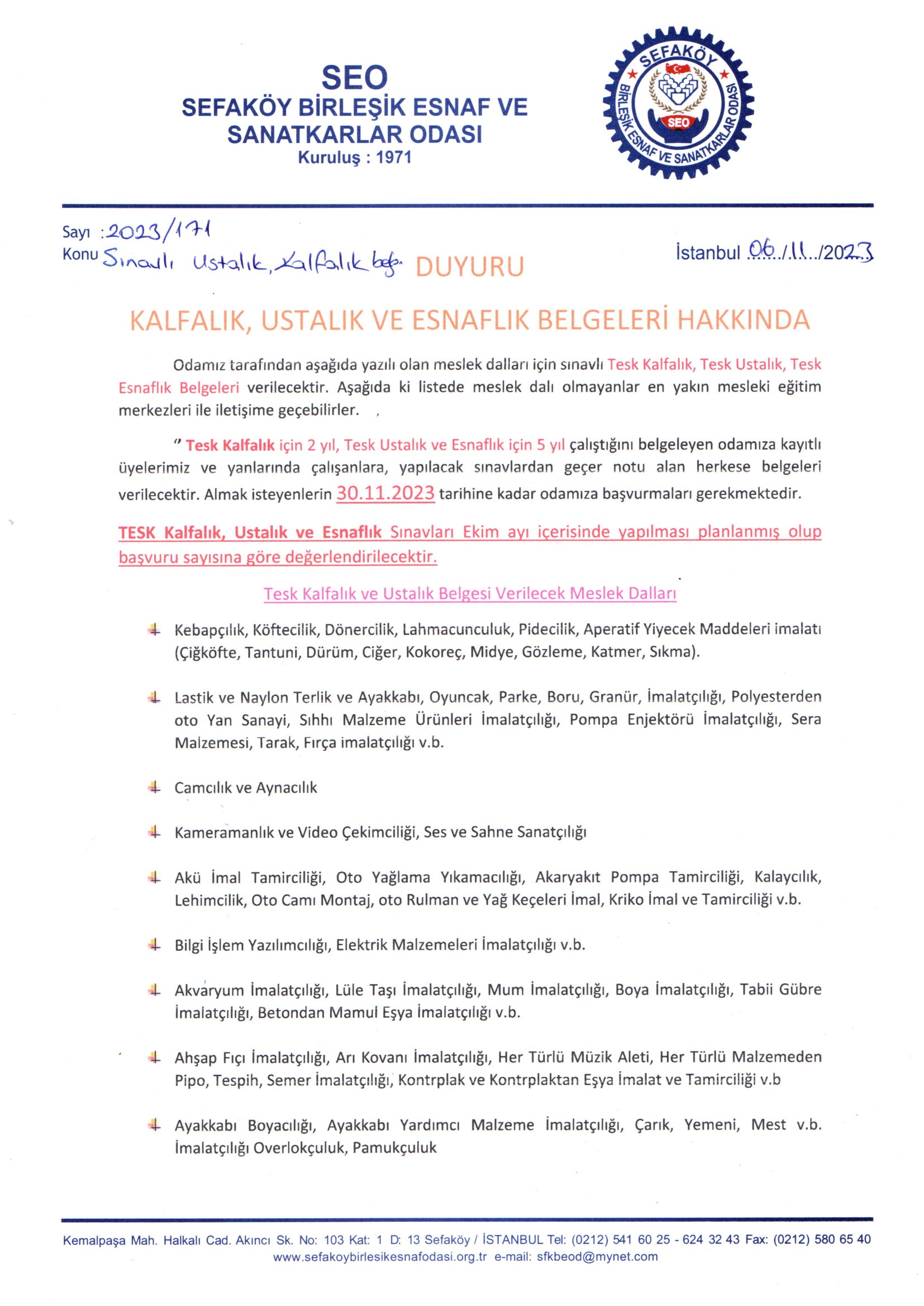KALFALIK, USTALIK VE ESNAFLIK BELGELERİ HAKKINDA DUYURU.