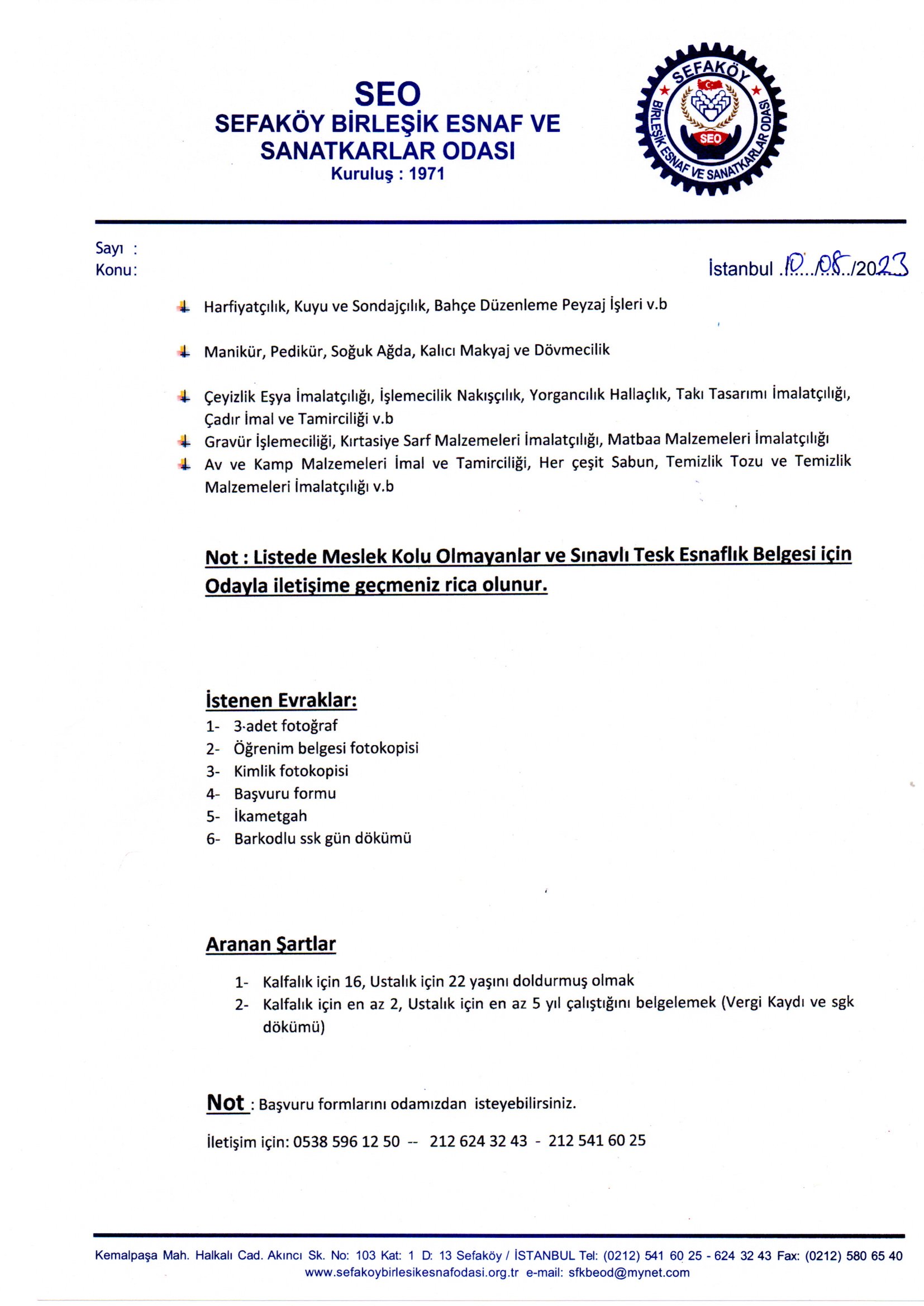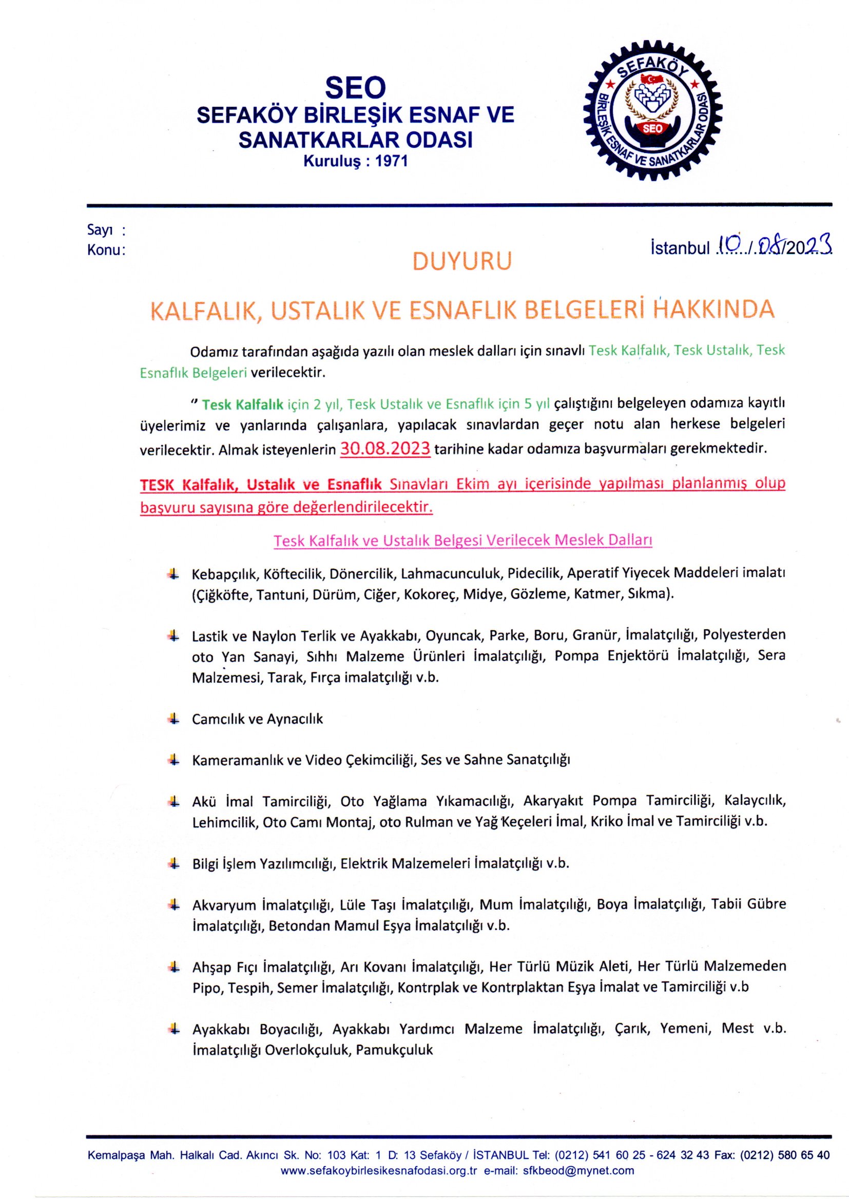 SINAVLI USTALIK KALFALIK VE ESNAFLIK BELGELERİ HAKKINDA