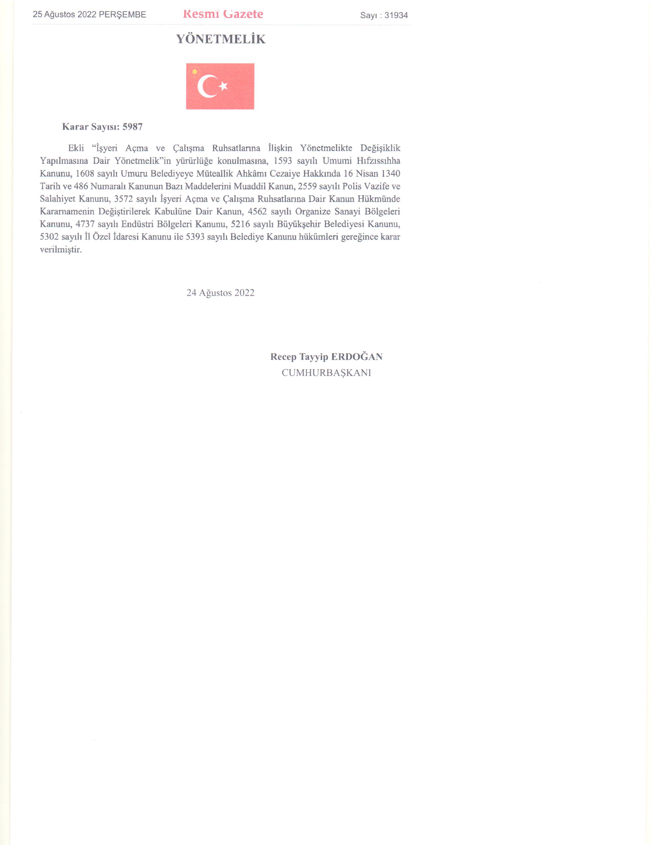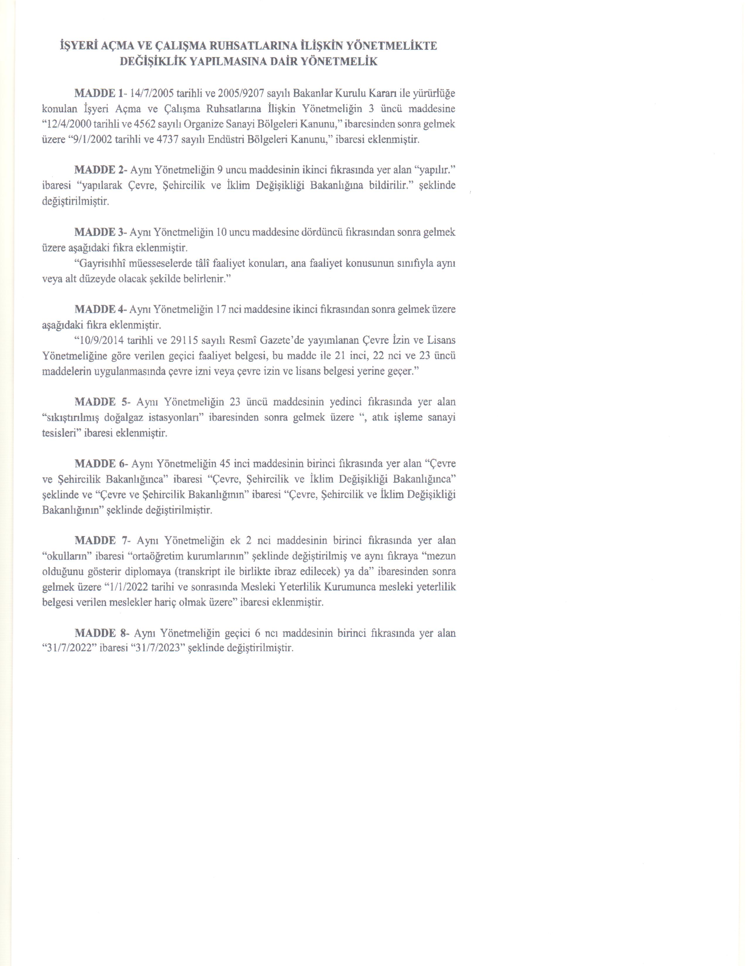 İşyeri Açma ve Çalışma Ruhsatlarına İlişkin Yönetmelik Değişikliği Hakkında (RESMİ GAZETE)