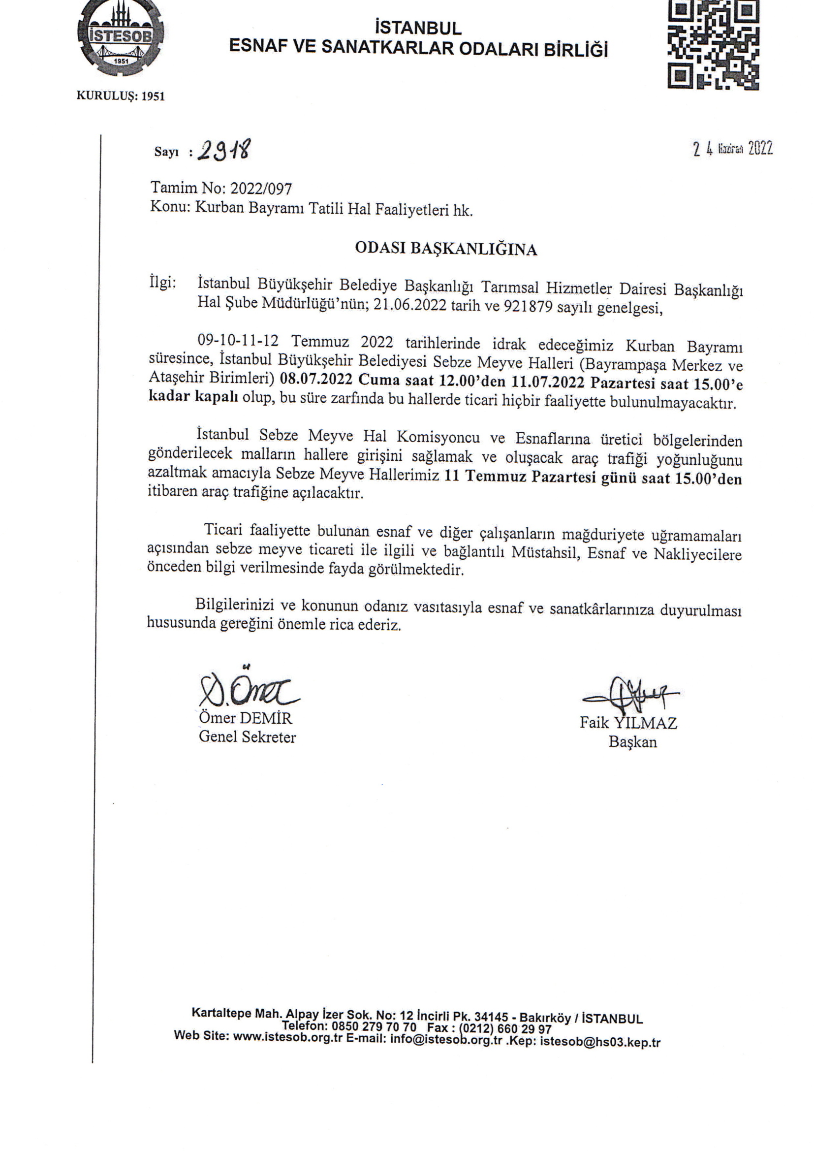 Kurban Bayramı Tatili Hal Faaliyetleri Hakkında Kurban Bayramı Tatili Hal Faaliyetleri Hakkında Bilgilendirme!