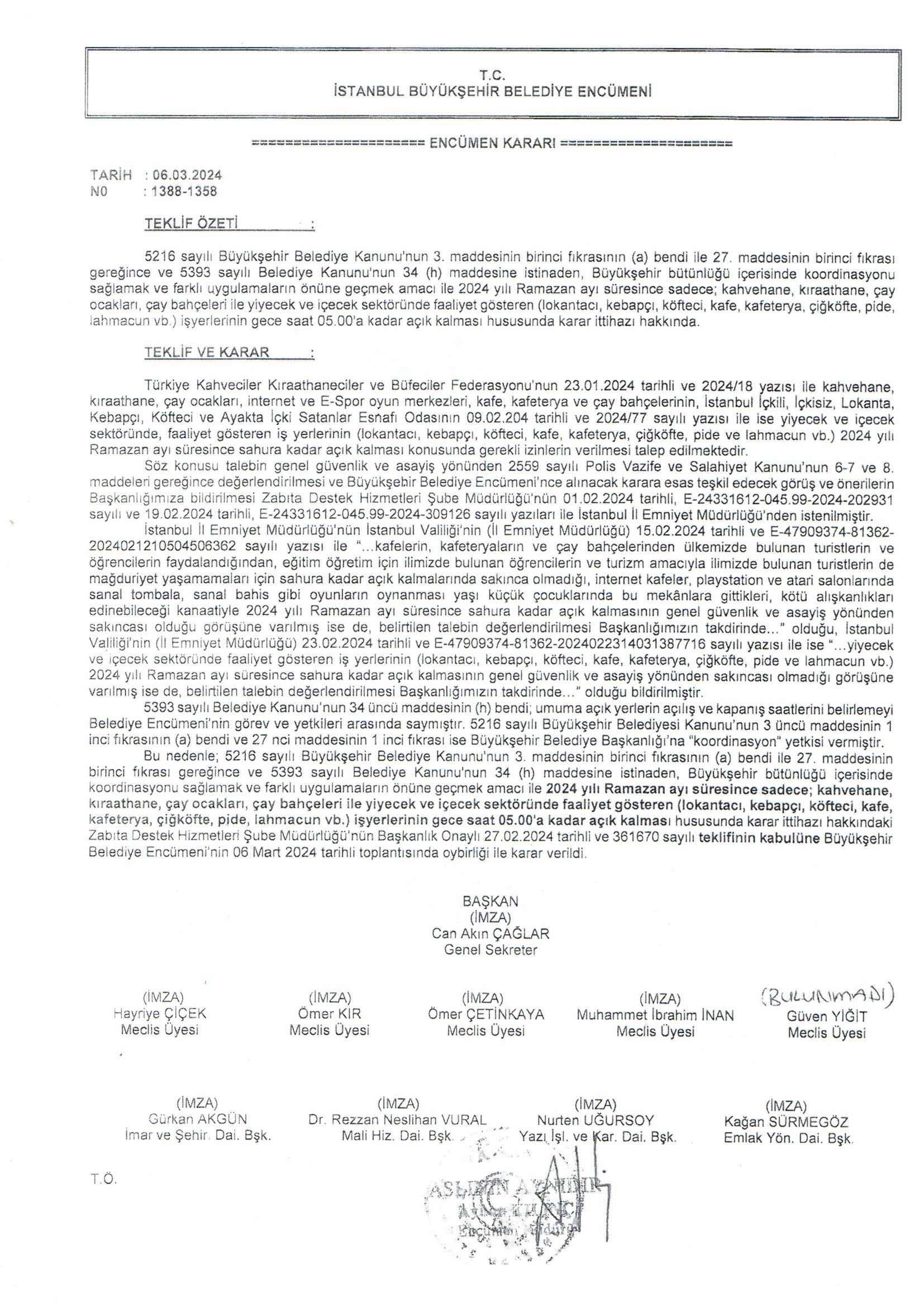 RAMAZAN AYI SÜRESİNCE SAHURA KADAR AÇIK KALACAK İŞLETMELER HAKKINDA ENCÜMEN KARARI